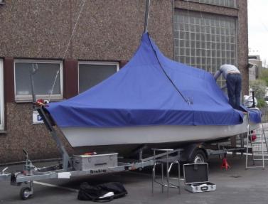 Mitte April gehts zum Bootssattler und "El Rapide" bekommt eine maßgeschneiderte Ganzpersenning - da wird das Maststellen gleich ausprobiert - klappt gut!